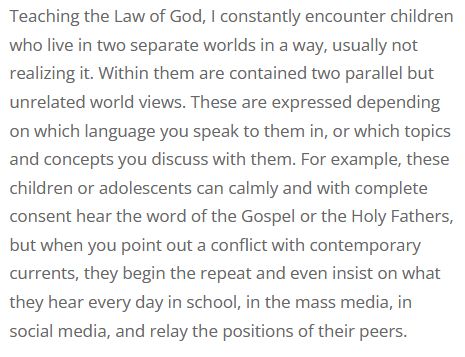 „Wenn ich das Gesetz Gottes lehre, begegne ich ständig Kindern, die gewissermaßen in zwei getrennten Welten leben und dies normalerweise nicht erkennen. In ihnen sind zwei parallele, aber nicht miteinander verbundene Weltbilder am Werk. Diese äußern sich je nachdem, in welcher Sprache einer mit ihnen spricht oder welche Themen und Konzepte jemand mit ihnen diskutiert. Diese Kinder oder Jugendlichen können zum Beispiel ruhig und mit voller Zustimmung das Wort des Evangeliums oder der heiligen Väter hören, aber wenn sie auf einen Konflikt mit zeitgenössischen Strömungen hingewisen werden, beginnen sie zu wiederholen, was sie jeden Tag in der Schule, in den Massenmedien und in sozialen Medien hören, bestehen sogar darauf und geben die Positionen ihres Freundeskreises weiter.“