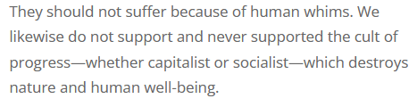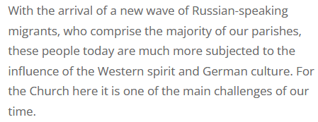 „Wir haben auch nie den Fortschrittskult – ob kapitalistisch oder sozialistisch – unterstützt und werden ihn nicht unterstützen, da er die Natur und das menschliche Wohlergehen zerstört. In Deutschland erreichen all diese Angelegenheiten die Familien unserer Gemeindemitglieder […] Mit der Ankunft einer neuen Welle russischsprachiger Migranten, die den Großteil unserer Gemeinden ausmachen, sind diese Menschen heute viel stärker dem Einfluss des westlichen Geistes und der deutschen Kultur ausgesetzt. Für die Kirche liegt hier eine der zentralen Herausforderungen unserer Zeit.“