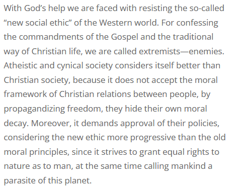 „Mit Gottes Hilfe stehen wir widerstrebend der sogenannten Neuen Sozialethik der westlichen Welt gegenüber. Weil wir die Gebote des Evangeliums und der traditionellen christlichen Lebensweise bekennen, werden wir Extremisten, ja sogar Feinde genannt. Die atheistische und zynische Gesellschaft hält sich für besser als die christliche Gesellschaft, weil sie den moralischen Rahmen der christlichen Beziehungen zwischen den Menschen nicht akzeptiert; indem sie Freiheit propagiert, verbirgt sie ihren eigenen moralischen Verfall. Darüber hinaus fordert sie die Zustimmung zu ihrer Politik, da sie die neue Ethik für fortschrittlicher hält als die alten moralischen Prinzipien, wobei sie danach strebt, der Natur die gleiche Rechte wie dem Menschen zu gewähren und gleichzeitig die Menschheit als Parasiten dieses Planeten bezeichnet.“
