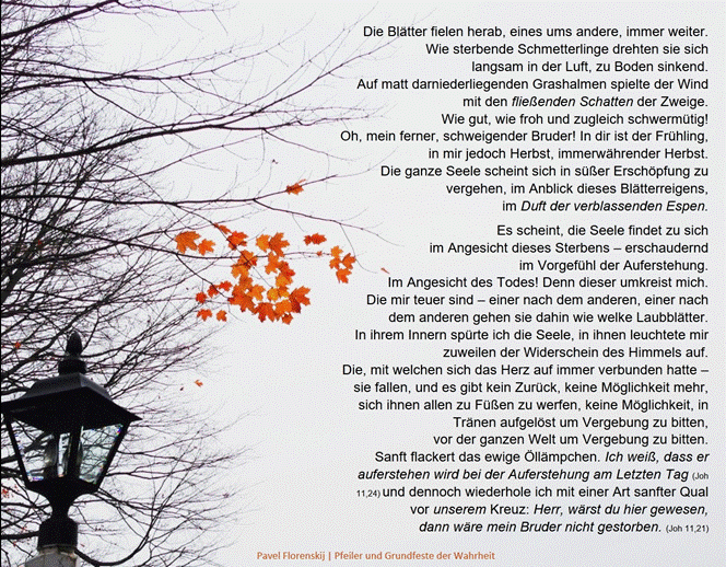 „Ohne Unterlass fällt das Herbstlaub; Blatt für Blatt tanzt über dem Boden im Kreise. Still flackert das ewige Flämmchen der Öllämpchen, und einer nach dem anderen sterben die Nächsten. ‚Ich weiß, dass er auferstehen wird bei der Auferstehung am Letzten Tag.‘ Und dennoch wiederhole ich mit einer Art sanfter Qual vor unserem Kreuz, welches du aus einem einfachen Stock gemacht hast und das von unserem liebevollen Altvater geweiht wurde: ‚Herr, wärst du hier gewesen, dann wäre mein Bruder nicht gestorben.‘ “4