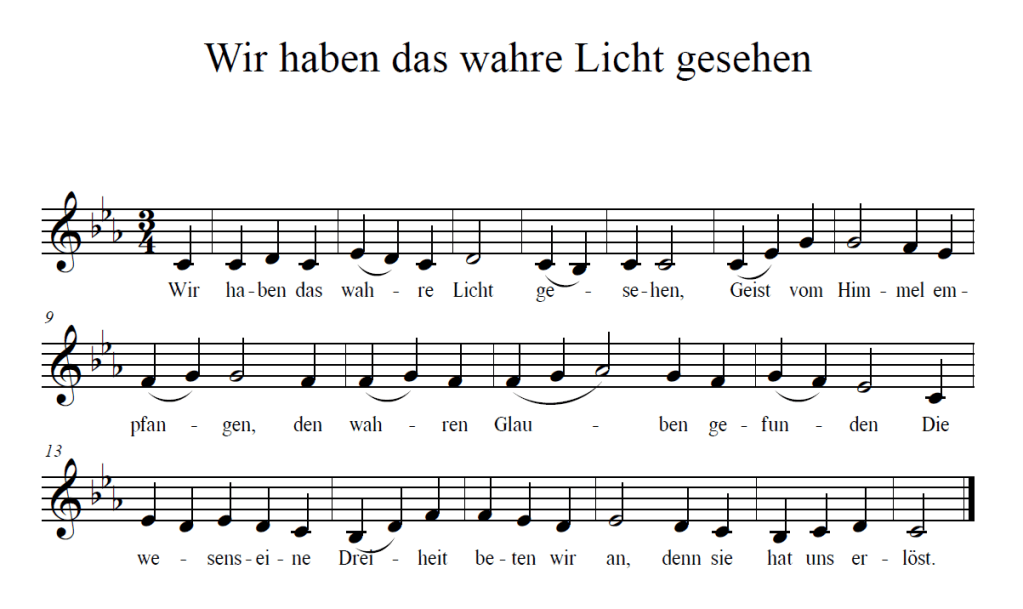 Für die byzantinische Tradition gibt es nichts Vergleichbares in Deutsch. Jeder Hymnos muss erst mühsam durch Kontrafaktur entwickelt werden, insofern jede Noten-Vorlage in byzantinischer Notenschrift mit einem passenden deutschen Text unterlegt werden muss (s. Bspl. 1).