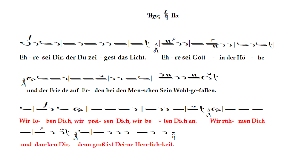 Für die byzantinische Tradition gibt es nichts Vergleichbares in Deutsch. Jeder Hymnos muss erst mühsam durch Kontrafaktur entwickelt werden, insofern jede Noten-Vorlage in byzantinischer Notenschrift mit einem passenden deutschen Text unterlegt werden muss (s. Bspl. 1).