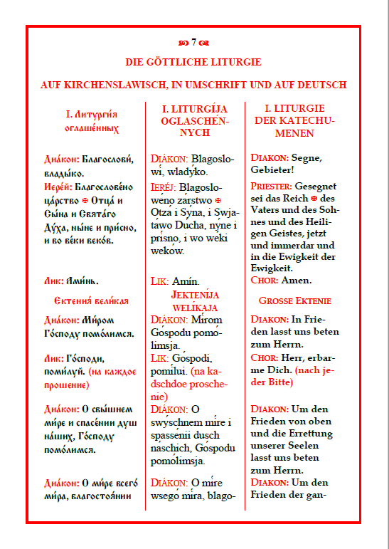 In dieser Form ist dies etwas gänzlich Neues. Zwar erschien bereits 1979 ein zweispaltiges Büchlein mit der Göttlichen Liturgie, das in der rechten Spalte eine Übersetzung ins Deutsche und links eine Transliteration beinhaltete1.