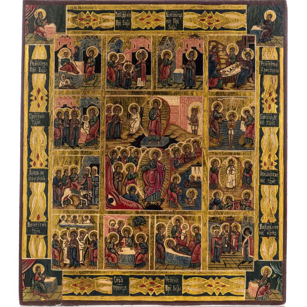 Die abgebildete Ikone zeigt in einem Rahmensystem die zwölf Feste, die gemäß der Tradition dargestellt werden.