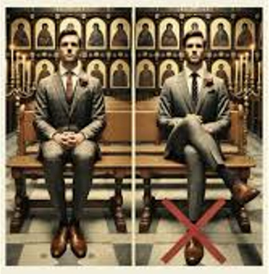 Haltung bewahren: Wie in dem verlinkten Video erwähnt, ist es in orthodoxen Kirchen verpöhnt, beim Sitzen wie im Theater oder Kino die Beine kreuzförmig übereinander zu schlagen, denn das Kreuz ist das Zeichen des Todes und der Auferstehung Christi. Stattdessen ist eine der Würde der Liturgie entsprechende Haltung der Andacht und des Gebets angebracht.
